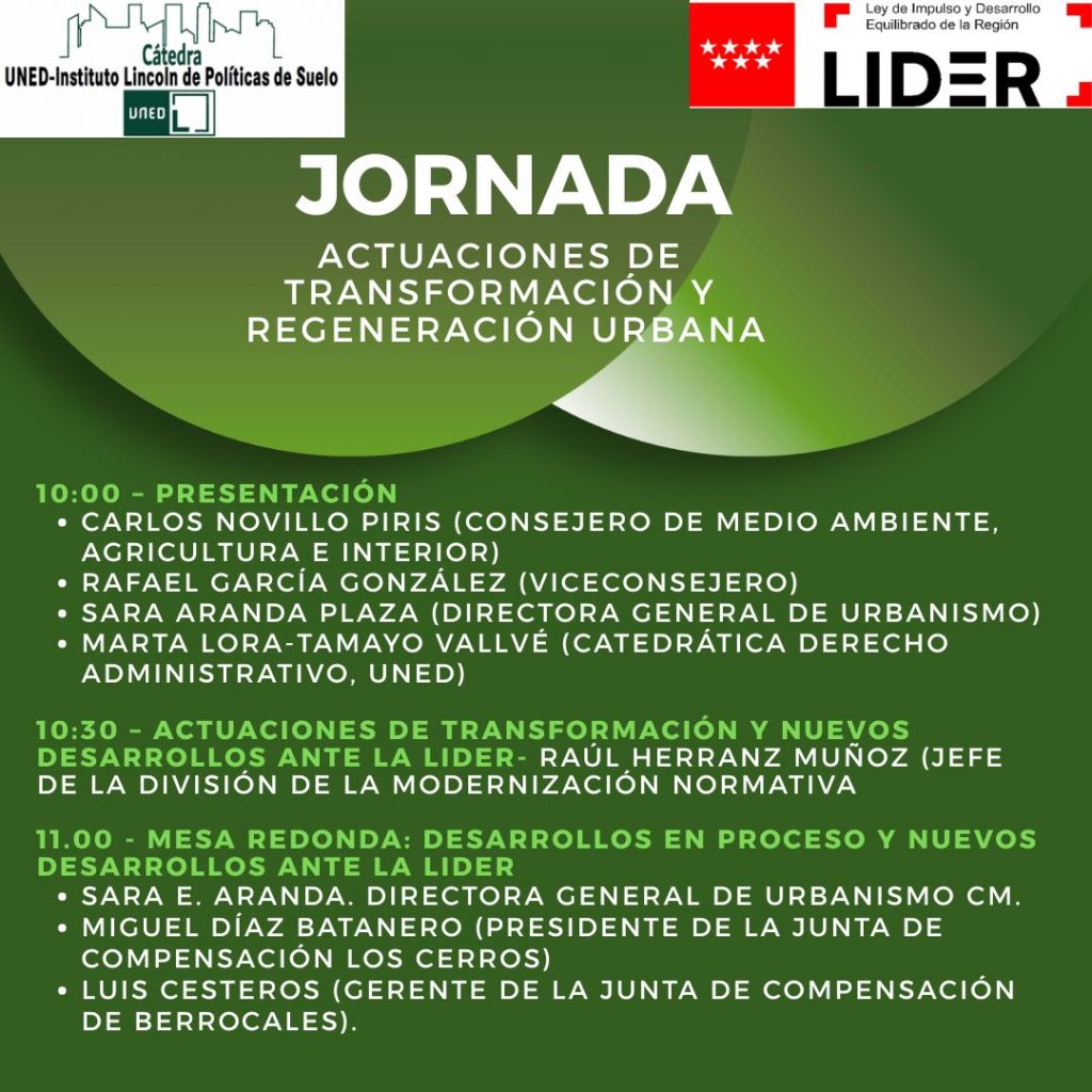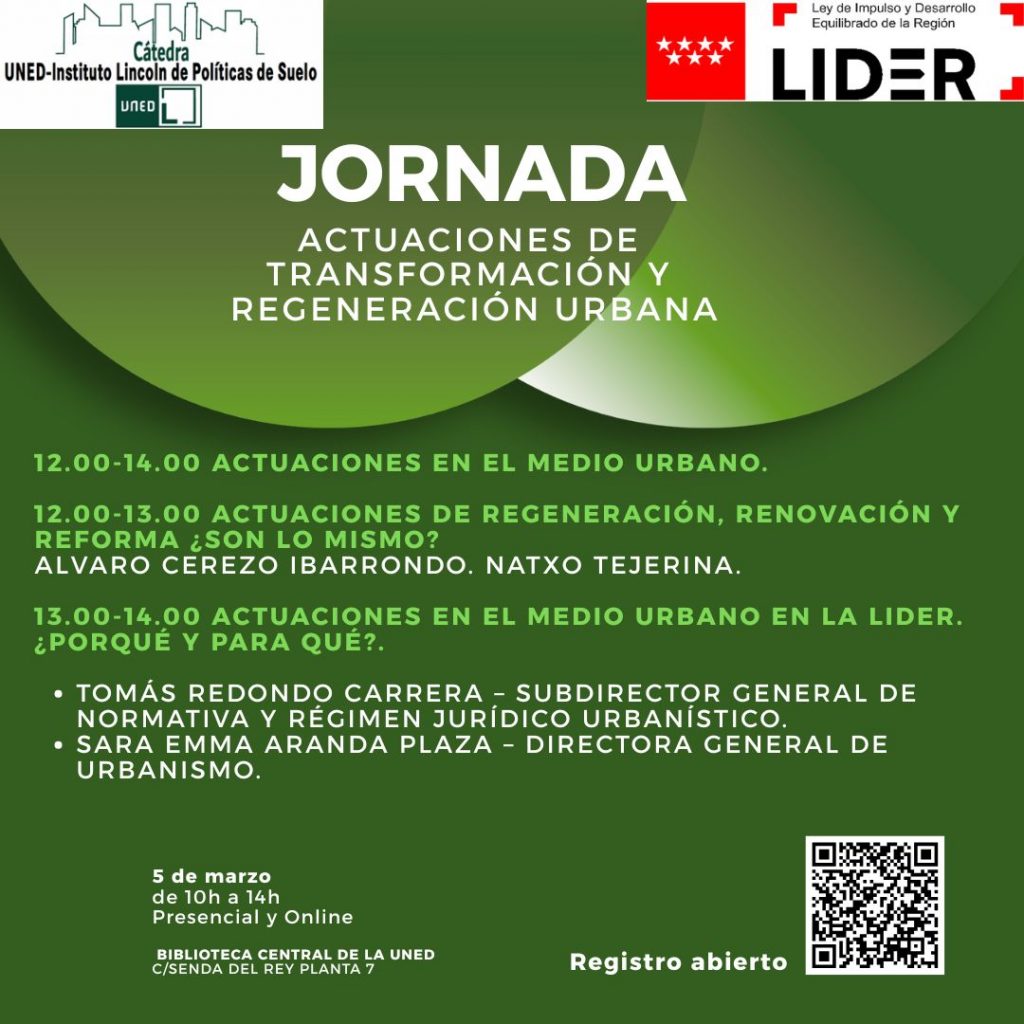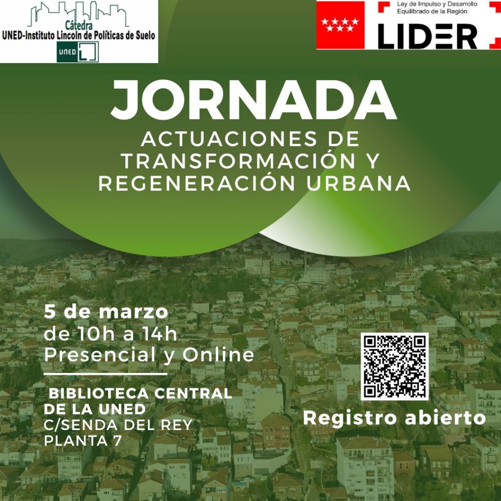 El próximo 5 de marzo de 2026, la Universidad Nacional de Educación a Distancia (UNED) acogerá en su Biblioteca Central (C/ Senda del Rey, planta 7) la jornada “Actuaciones de Transformación y Regeneración Urbana en LIDER”, un encuentro académico e institucional centrado en el análisis de la Ley de Impulso y Desarrollo Equilibrado de la Región (LIDER) de la Comunidad de Madrid.