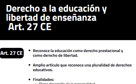 Regulación: art. 27 de la Constitución Española; art. 26 de la Declaración Universal de los Derechos Humanos; art. 13.1 del Pacto Internacional de Derechos Económicos, Sociales y Culturales; arts. 28 y 29 de la Convención de los Derechos del Niño; art. 2 del Protocolo 1 del Convenio Europeo de Derechos Humanos y art. 14 de la Carta de Derechos Fundamentales de la Unión Europea.