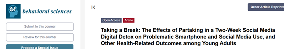 Enlace del artículo: «Taking a Break: The Effects of Partaking in a Two-Week Social Media Digital Detox on Problematic Smartphone and Social Media Use, and Other Health-Related Outcomes among Young Adults»