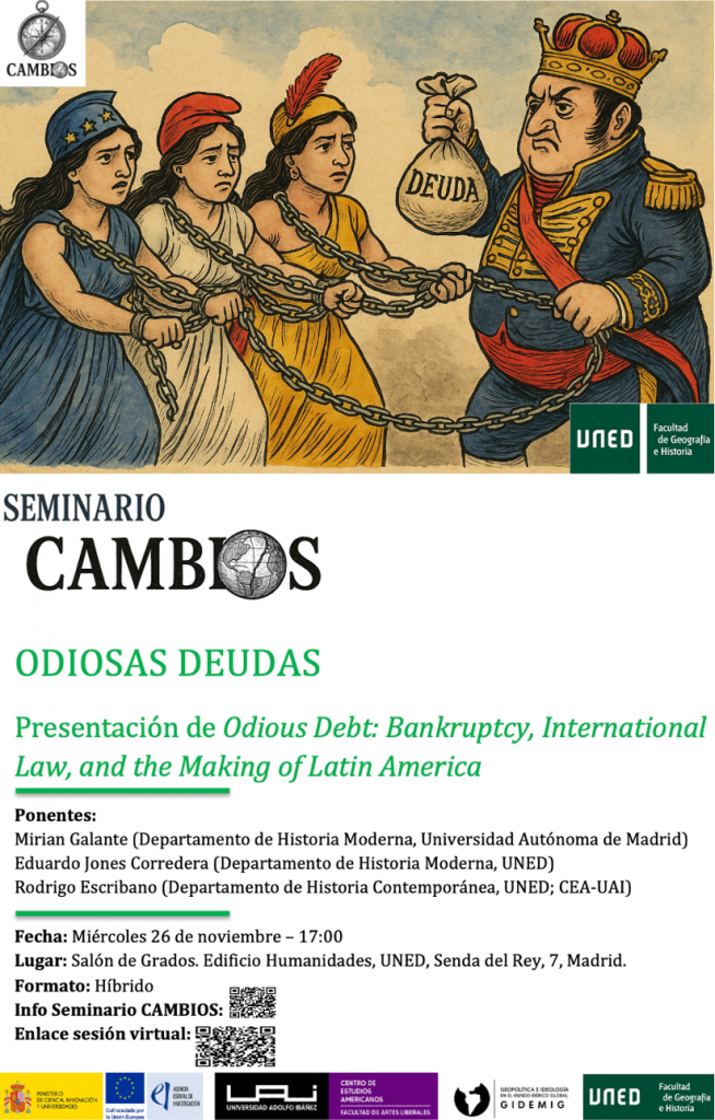 La sesión inaugural del seminario Cambios estuvo dedicada a examinar Odious Debt, obra reciente de Eduardo Jones Corredera, cuyo objetivo central es reconstruir el origen y desarrollo del concepto de “deuda odiosa” en el contexto hispanoamericano del siglo XIX. La discusión reunió a especialistas en historia moderna, contemporánea y política latinoamericana, generando un diálogo interdisciplinar sobre las dimensiones jurídicas, morales y políticas de la deuda pública en contextos posimperiales.