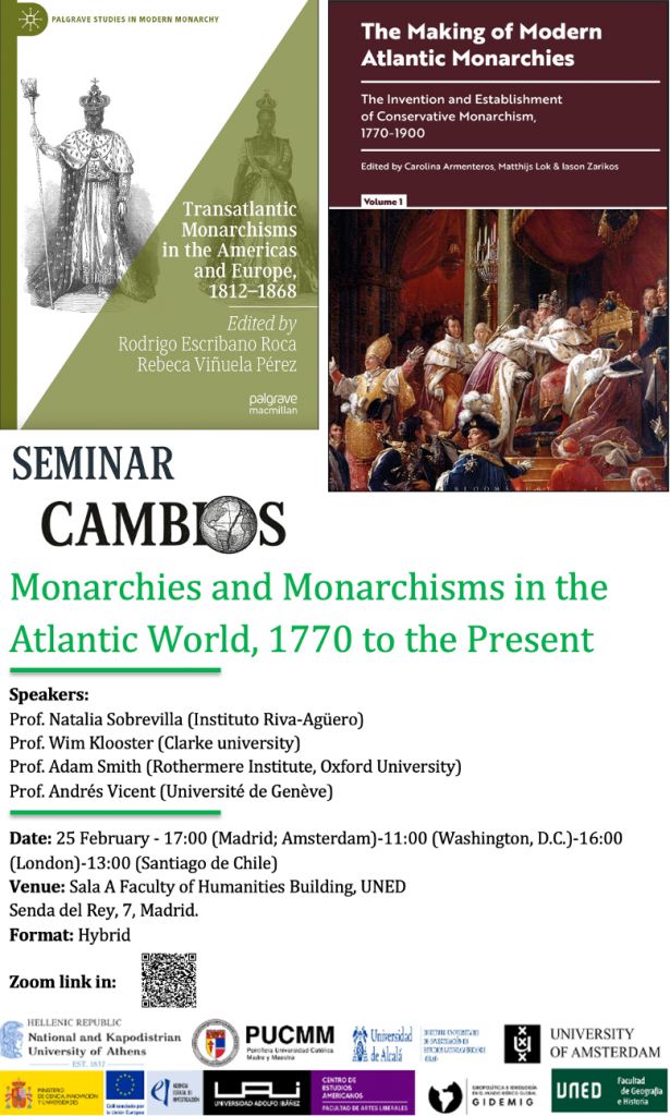 The seminar Monarchies and Monarchisms in the Atlantic World, 1770 to the Present offered a forum for debate on the historical evolution of monarchies and, centrally, on monarchism as a transnational political ideology in the Atlantic world from the age of revolutions to the present. Through the presentation and discussion of two recently published volumes—Making of Modern Atlantic Monarchies (Bloomsbury) and Transatlantic Monarchisms in the Americas and Europe (1812-1868) (Springer)—the seminar analysed the capacity of monarchies to adapt in contexts of imperial collapse, constitutional experimentation, and the formation of new political orders.