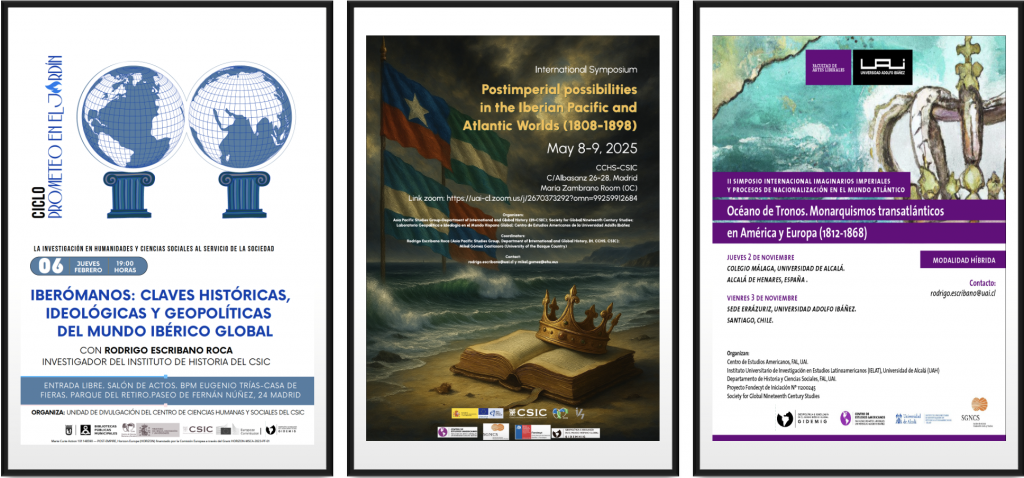 08-09/05/2025. Symposium «Postimperial possibilities in the Iberian Pacific and Atlantic Worlds (1808-1898)». Organizadores: Grupo de Estudios Asia Pacífico-Dpto. de Historia Internacional y Global (IH-CSIC); Society for Global Nineteenth Century Studies; Laboratorio Geopolítica e Ideología en el Mundo Hispano Global; Centro de Estudios Americanos de la Universidad Adolfo Ibáñez. https://www.cchs.csic.es/es/event/symposium-postimperial-possibilities-iberian-pacific-atlantic-worlds-1808-1898
