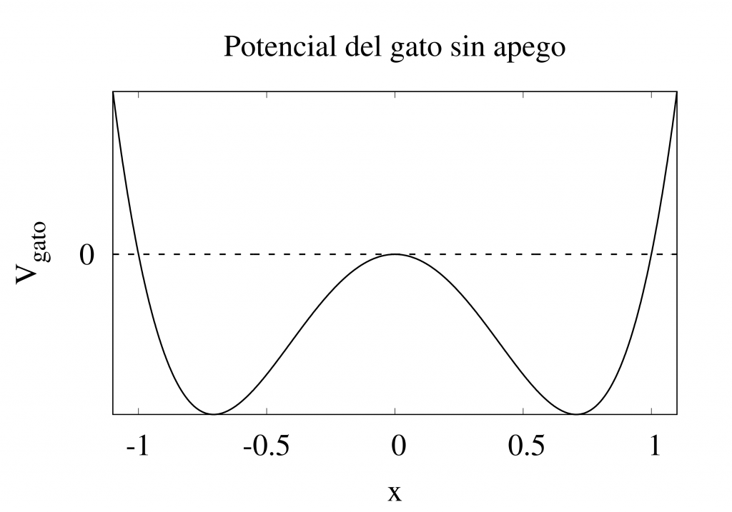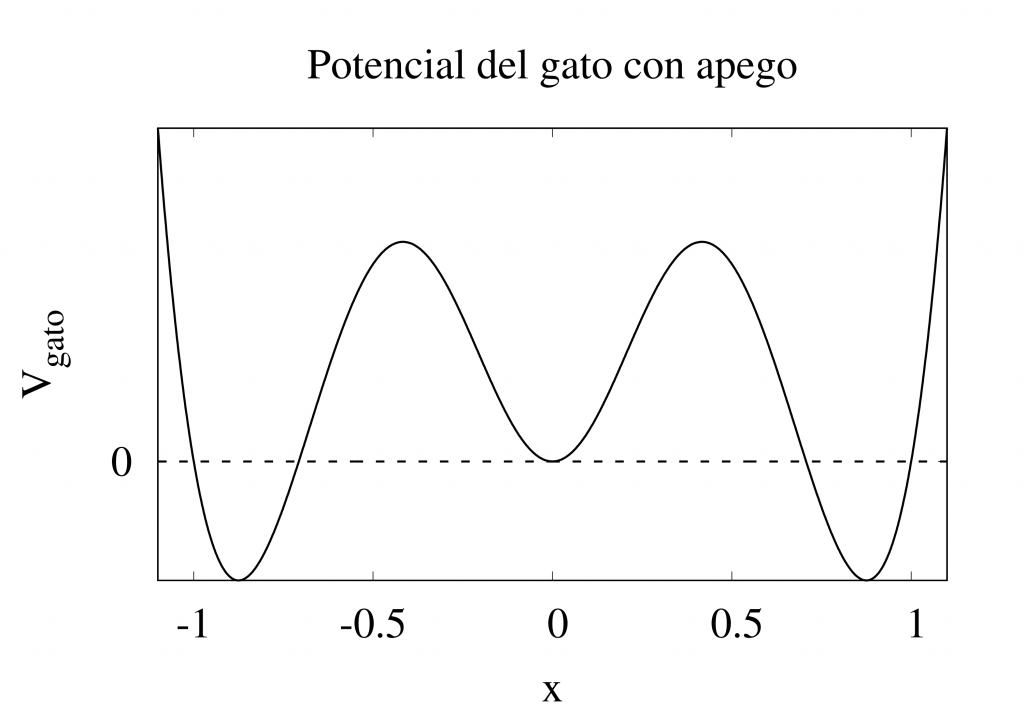 donde $m$ es la masa del gato, $x$ es el eje a lo largo del cual se mueve el gato (se modela como un movimiento unidimensional), y $\varepsilon>0$ es un coeficiente de fricción que depende de cada gato. El potencial $V_{\text{gato}}$ depende de un parámetro que hace que si el gato no tiene suficiente apego por el humano, tenga dos puntos estables a cierta distancia de este (los mínimos del potencial), y un punto inestable en la posición del humano (máximo local del potencial en $x=0$). Recordemos que en los puntos inestables, el gato no sufre ninguna fuerza para alejarse, pero que en cuanto cambie su posición mínimamente, se alejará mucho de dicho punto, en este caso, hasta los puntos estables. Esto significa que el gato muestra interés por estar donde se encuentra el humano, pero como este haga el más mínimo gesto, ruido o temblor, el gato se irá a su mínimo de potencial a observarlo desde cierta distancia. Cuando el gato tiene confianza con el humano, el potencial cambia y aparece un mínimo del potencial también en la posición del humano, lo que permite que este se pueda mover un poco más sin espantar al gato.