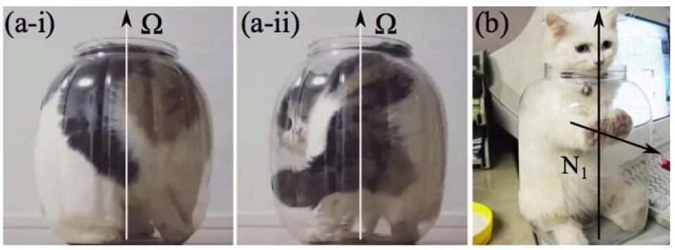 (a-i) y (a-ii) Un gato gira de forma espontánea dentro de una jarra cilíndrica, mostrando que los gatos son, además de líquidos, materiales activos. (b) Un gato dentro de una jarra muestra el efecto de Weissenberg, típico de fluidos viscoelásticos que giran en un recipiente: la fuerza normal sobre el recipiente implica una subida del fluido en la superficie, en la región del centro de la jarra. En el caso Newtoniano el efecto sería el contrario, con una subida del fluido en la superficie en la región de las paredes. Obtenido de [5].