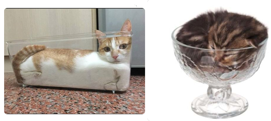 Pero existen más áreas de la física en las que los gatos están interesados. Uno de los campos en los que se encuentran más activos es el de los fluidos, y como ya hacían anteriormente, aquí también experimentan con sus propios cuerpos. De hecho, existe un artículo de investigación de Pongrácz, de 2024, en el que se estudian las propiedades líquidas de los gatos haciéndoles fluir a través de diferentes aberturas [4]. Efectivamente, cuando estos felinos ven una abertura por la que pueden fluir, no se lo piensan demasiado antes de realizar el experimento. En las imágenes siguientes se ven gatos rellenando el recipiente que los contiene, propiedad típica de los fluidos