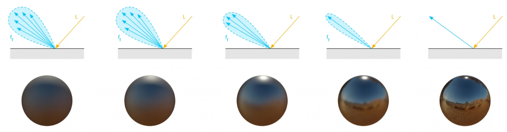 Ese pequeño cambio en la elección de las direcciones hace que la mayoría de los rayos reboten cerca del reflejo perfecto. El resultado es un material que empieza a mostrar brillos definidos, como si la superficie estuviera pulida o recubierta por una capa reflectante.