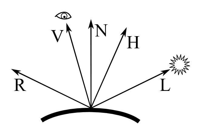 donde $k_S$ es el coeficiente de reflexión especular del material, $n_s$ mide la concentración del brillo y $\boldsymbol{H}$ es el vector medio normalizado entre la dirección de la luz $\boldsymbol{L}$ y la dirección del observador respecto a la superficie $\boldsymbol{V}$,