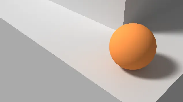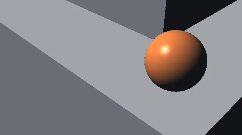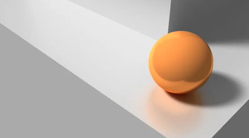 Al elegir los colores de los objetos en nuestra escena, podemos crear algo similar a lo que se observa en la siguiente imagen. Las superficies iluminadas por nuestro sol virtual muestran un degradado que nos ayuda a intuir la posición de la luz. Además, la esfera refleja un brillo adicional que nos sugiere que estamos frente a una superficie reflectante. Este brillo especular depende de la posición del observador, a diferencia del componente difuso, que se mantiene constante desde cualquier ángulo.
