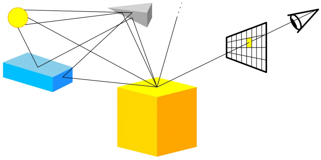 - Para cada píxel, generamos un camino (inverso) de luz, es decir, el recorrido que haría un fotón desde nuestro ojo hasta las fuentes de luz.