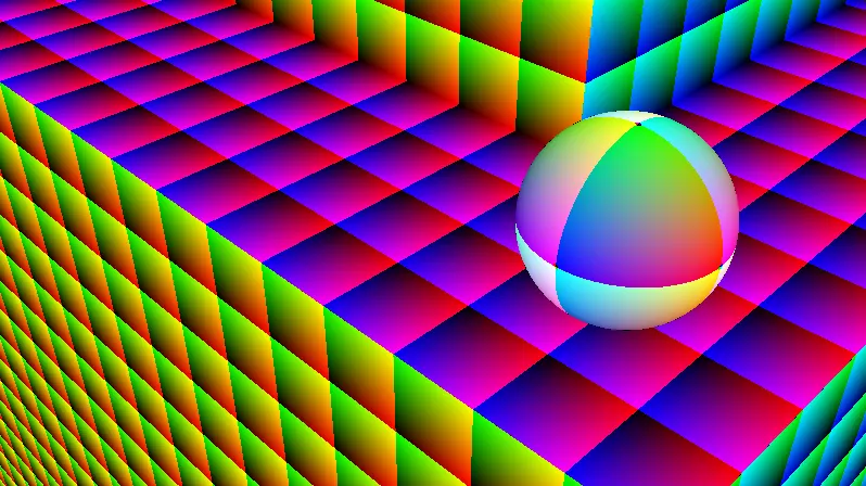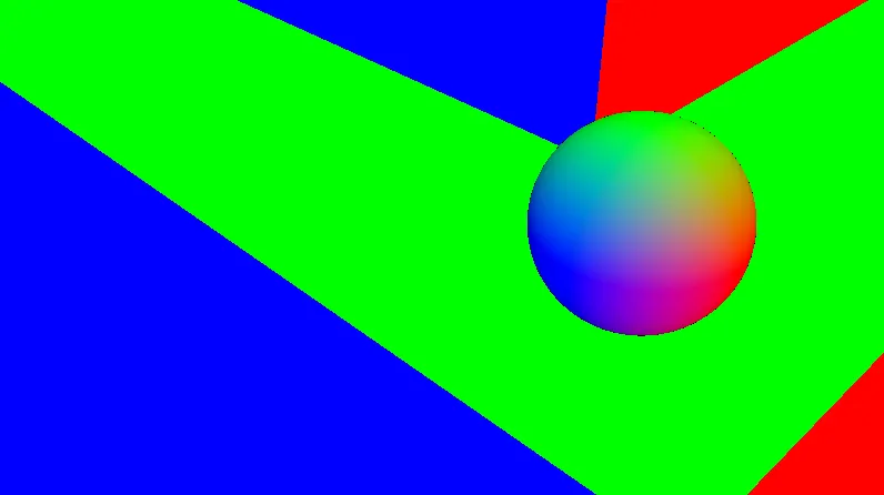 A continuación, podemos ver dos imágenes de nuestro ray marcher explorando una escena de prueba. Cuando choca con la superficie nos lo presenta con distintos colores: