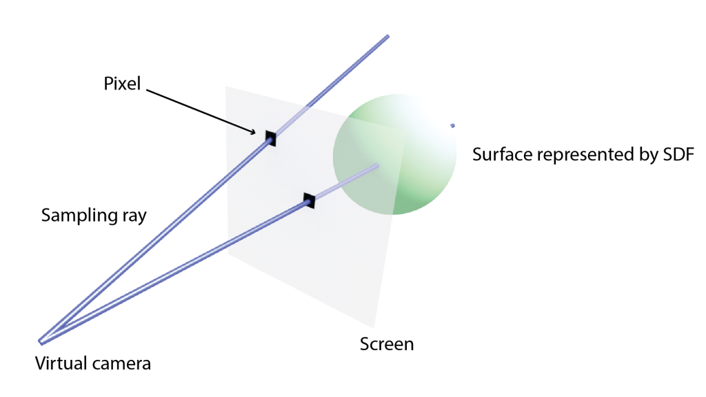 y del viaje de un rayo mediante la técnica de ray marching, en este caso una variante conocida como sphere tracing. Como hemos comentado antes, la distancia a la superficie más cercana determina exactamente cuánto podemos avanzar en cada paso.